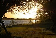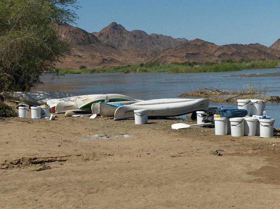 Kaum in Namibia ist auch unser erstes Ziel erreicht und wir steigen um in Kanus. Es wird auf dem Orange River gepaddelt. Für blutige Anfänger ist das gar nicht so leicht, besonders wenn sich die zwei in einem Bott nicht immer einig sind. Da genügt schon eine harmlose Stromschnelle und schon sind wir umgekippt und froh dass es im Fluss keine Krokodile gibt. Zum Glück erwischt es später auch noch das andere Boot, das so laut gelacht hat. Diese Nacht wird auf einer kleinen Insel mitten im Orange River im Schlafsack unter freiem Sternenhimmel verbracht. Am Morgen paddeln wir dann weiter bis zu der Stelle an dem wir dann mit einem Bus abgeholt werden sollen. Wir mussten eine ganze Zeit warten, denn durch recht viel Wasser und eine dadurch schnelle Strömung waren wir viel zu schnell am Ziel.